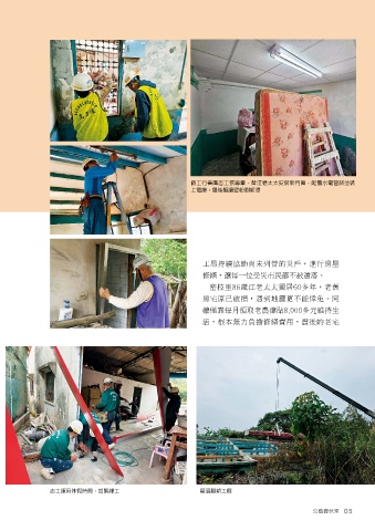做工行善團志工依專業,替江老太太安裝新門窗,配置水電管路並裝 上電燈,最後幫牆壁粉刷新漆 工局持續協助尚未列管的災戶,進行房屋 修繕,讓每一位受災市民都不被遺落。 密枝里86歲江老太太獨居60多年,老舊 房宅原已破損,遇到地震更不能倖免。阿 嬤僅靠每月領取老農津貼8,000多元維持生 活,根本無力負擔修繕費用,震後的老宅 志工運用休假時間,加緊趕工 屋頂翻新工程 公益做伙來 05